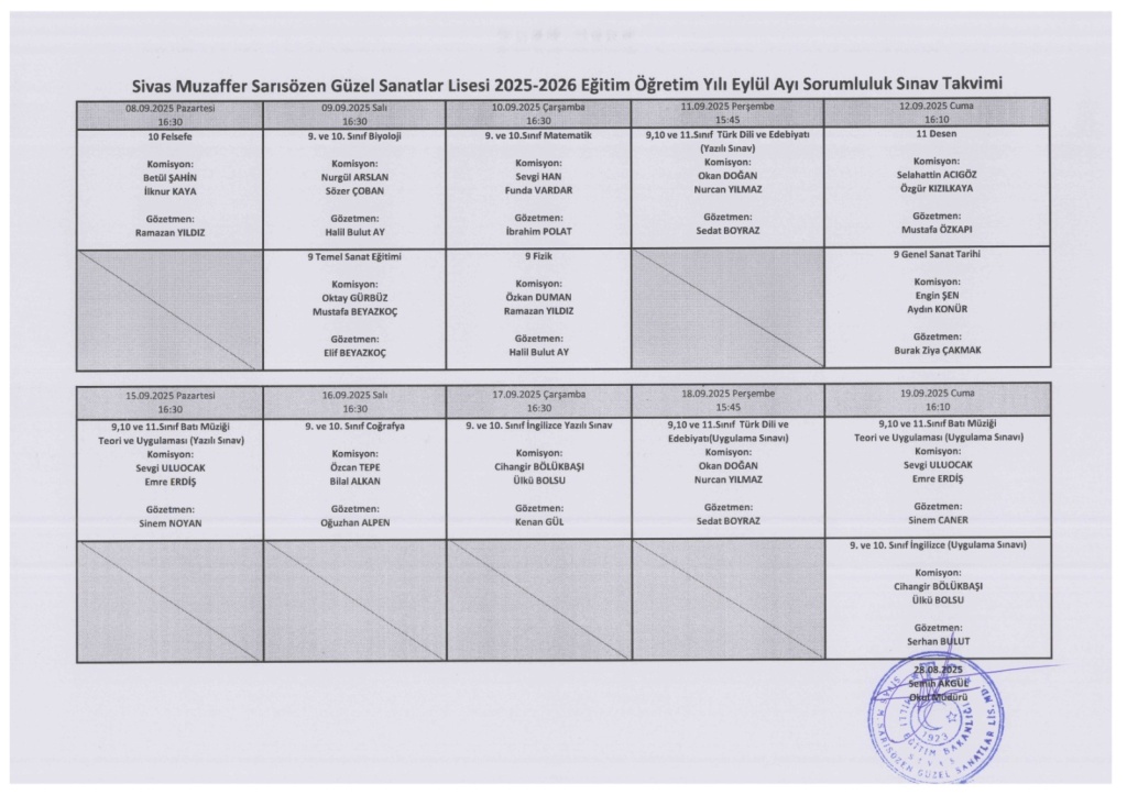 Sorumlu dersi bulunan öğrencilerimizin dikkatine, eylül ayı sorumluluk sınavları takvimi aşağıda paylaşılmıştır.